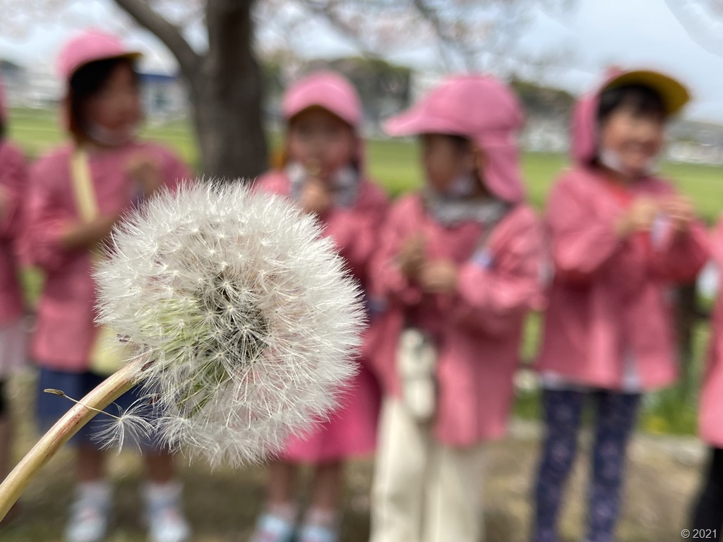 水辺館で亀の勉強をした後、たんぽぽの花や葉っぱの形を見て、綿毛を見つけました。