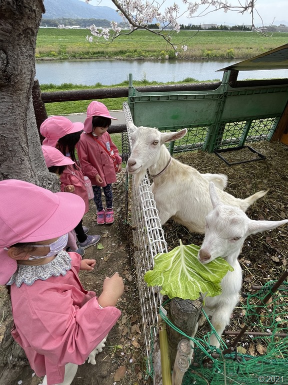 ヤギのエサやりの様子です。保育園からキャベツを持って行きました。