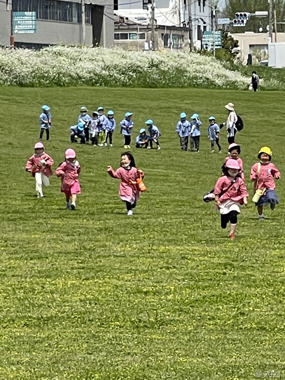 遠賀川の橋を渡り遊具で遊んだ後、河川敷でのかけっこの様子です。